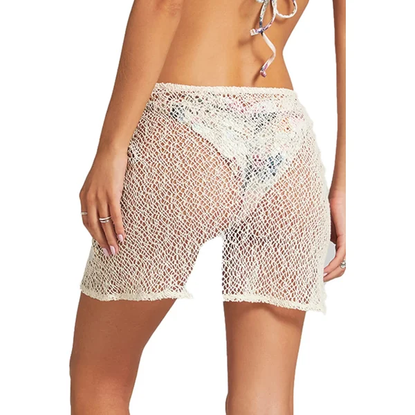 Sarong features open weave crochet and a self tie waist closure with a ring accent and tassel details.