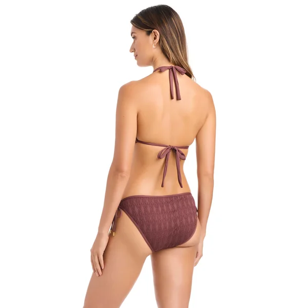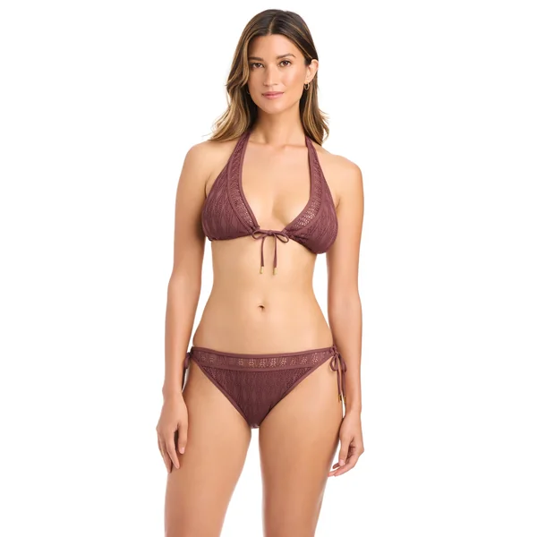 Bikini top features crochet overlay, front tie detail, and adjustable halter tie. Offers removable cups and a tie back closure.