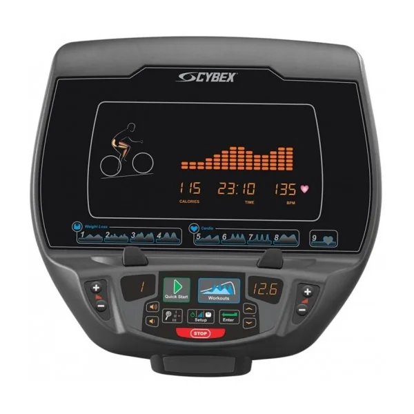 Display: Graphic display of profile via 8 × 15 LED matrix; Numeric display of time, distance, calories, calories/hour, METs, Watts, RPM, and heart rate including multi-color indication of heart rate range; Lower display shows road speed and resistance level