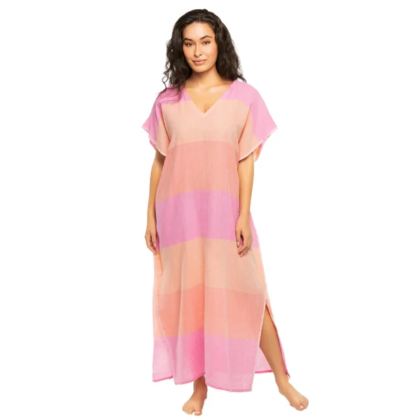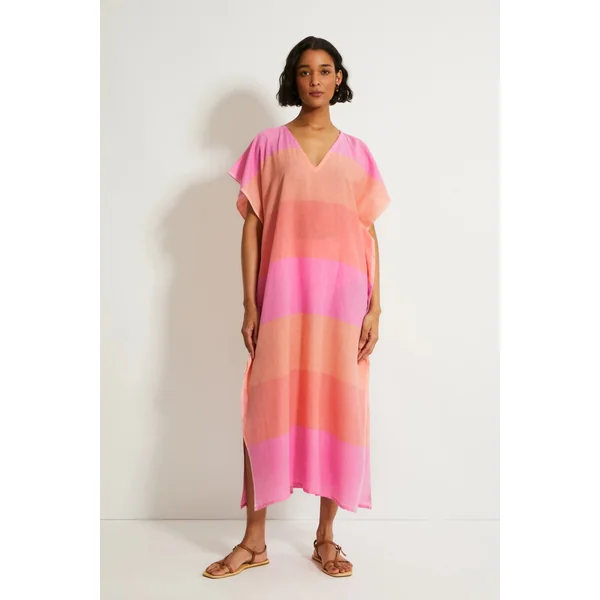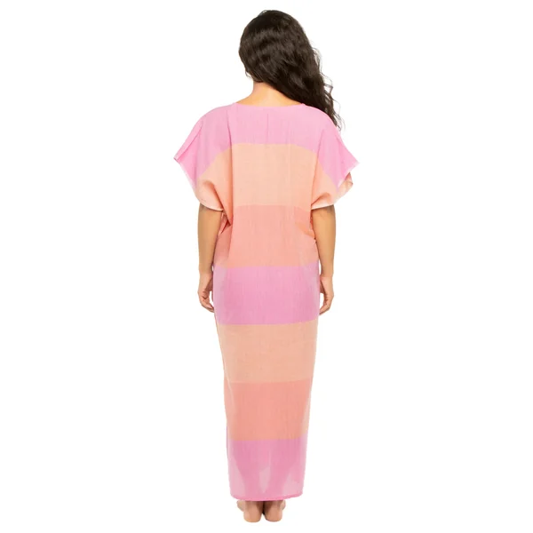 Dalila handwoven caftan features light gauzy fabric, ombre color block pattern and hand twisted fringe hem.