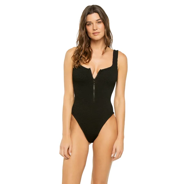 Dallas one piece swimsuit features a zip-up front detail and a high-leg cut, offers minimal bottom coverage. Signature crinkle-stretch fabrication is designed to hug the body in all the right places, its unique texture stretches and retracts to enhance your shape while maintaining its own.