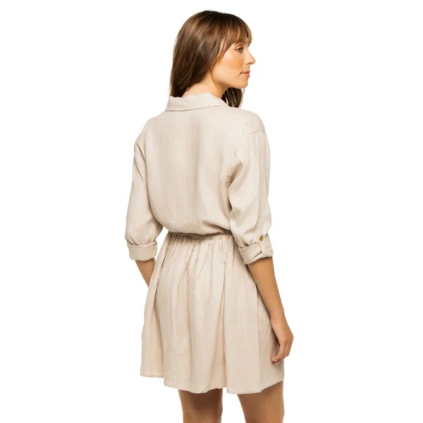 Shirt dress features a button front, long sleeves with roll-tab cuffs, and drawstring waist. Offers convenient pockets.