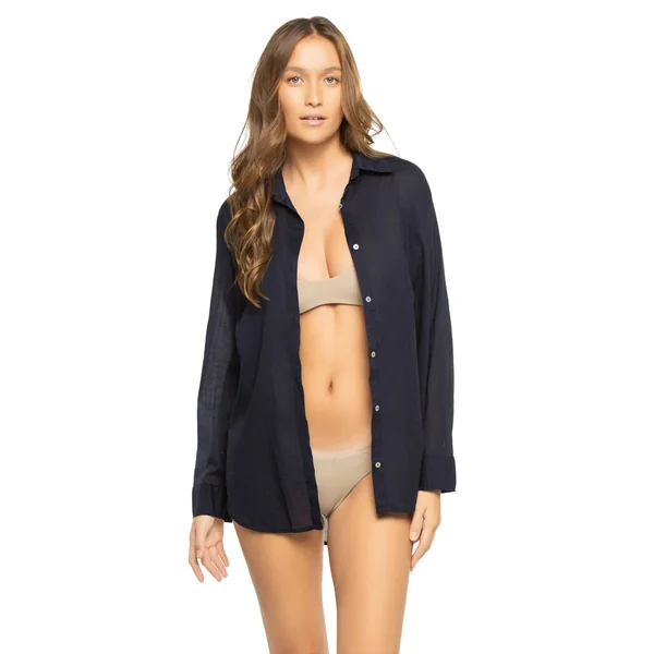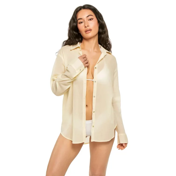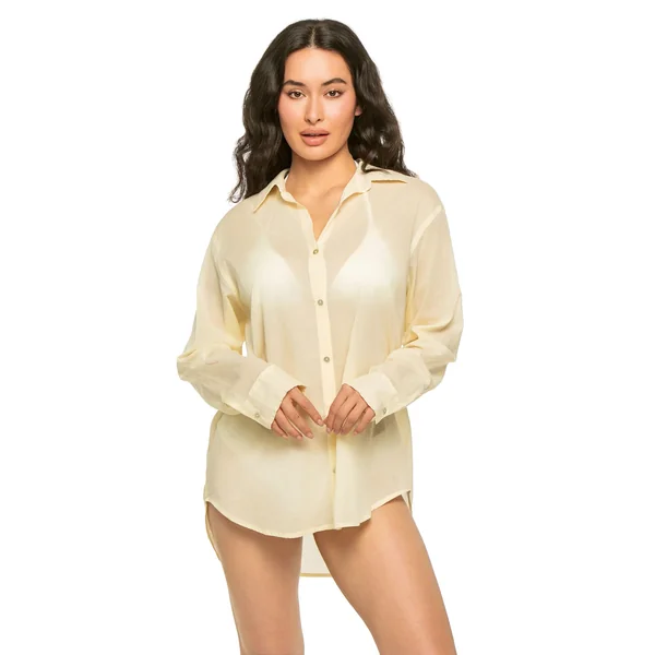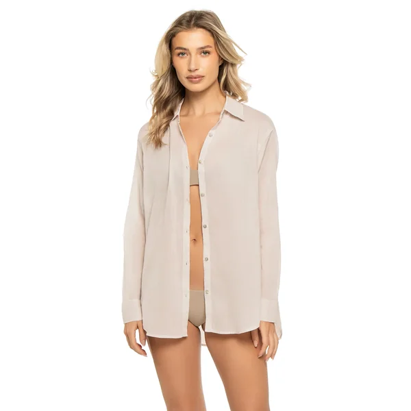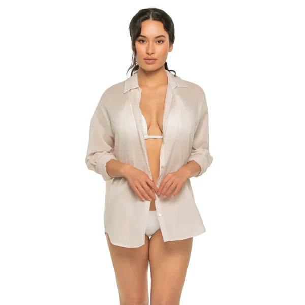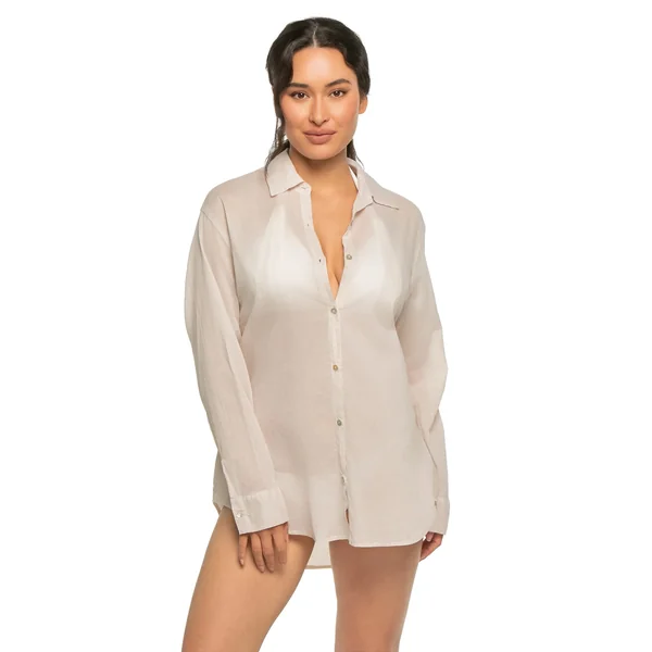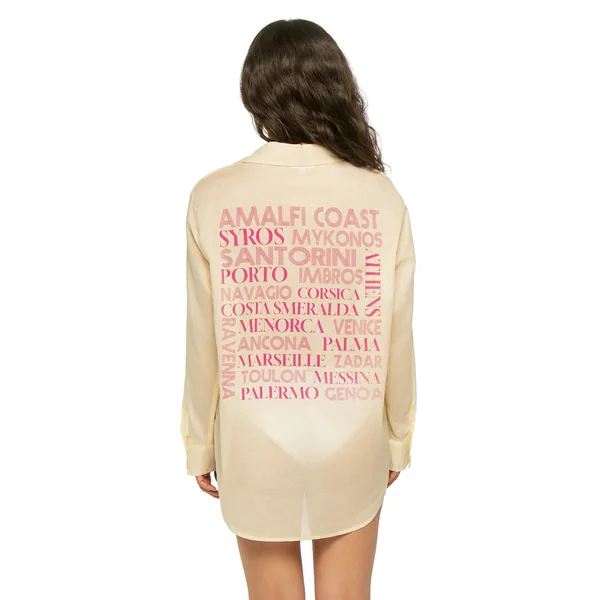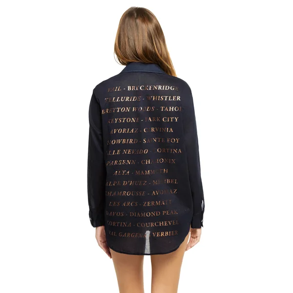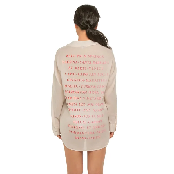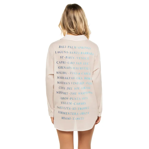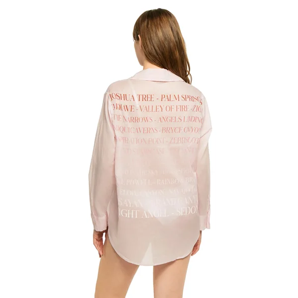 Destinations oversized shirt dress features a graphic back, hi-low hem, oversized fit and button up front.