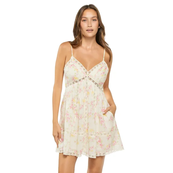 Floral mini dress features lace insets and trim, smocked back and adjustable straps.