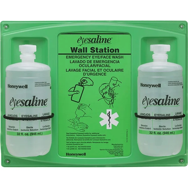 The double emergency eyewash station is made of high-impact plastic and has full emergency instructions on its front panel. Comes complete with two 32 oz. bottles of Eyesaline® Emergency Eye Wash, which is a buffered, isotonic saline solution that is sterile and superior to tap water. The bottle has a tamper-resistant, twist-off tab the employees can be easily remove in emergencies. The extended flow nozzle provides a longer flow. Replacement bottles sold separately.