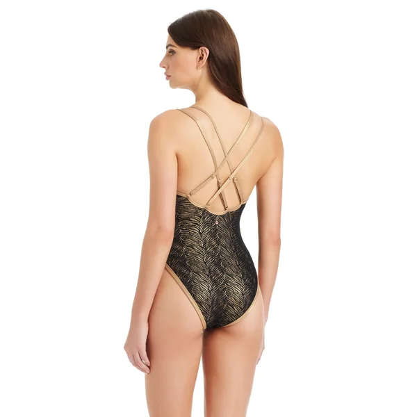 One piece swimsuit features metallic sheen, metallic edging and split straps that adjust in the back. Offers a high leg cut and moderate bottom coverage.