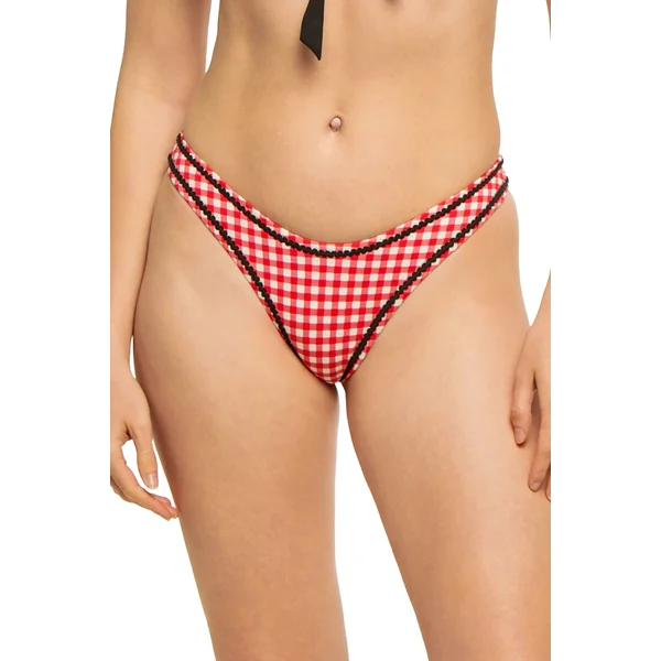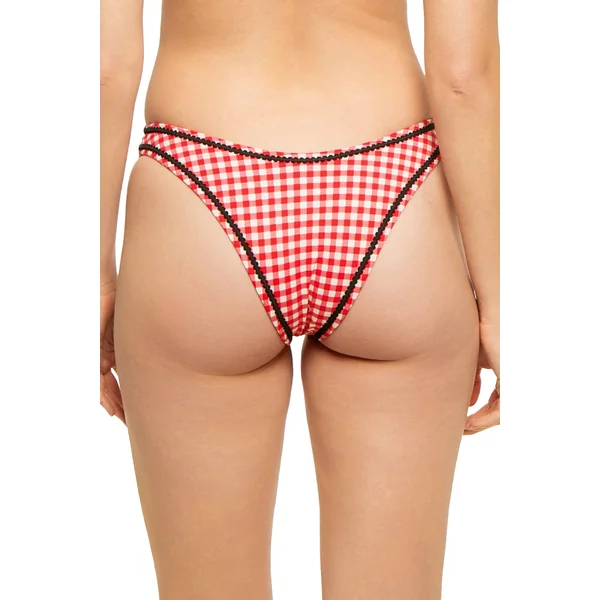 Dove bikini bottom features checkered print and contrast trim. Offers a high leg-line and minimal coverage.