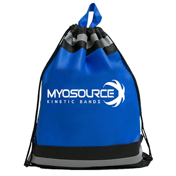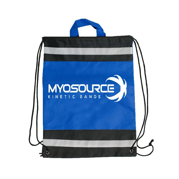 • Bright blue and black bag features the Myosource Kinetic Bands logo in a white screenprint and is outlined with 1″ wide reflective strips, providing some degree of visibility in the dark.