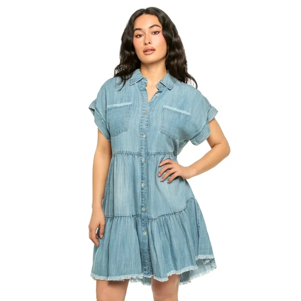 Dress shirt featuring a collared neckline, button-up front, short sleeves, and a frayed hem.