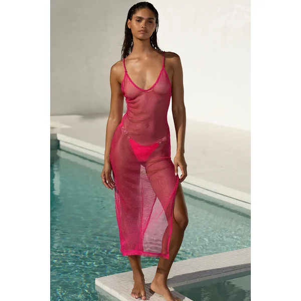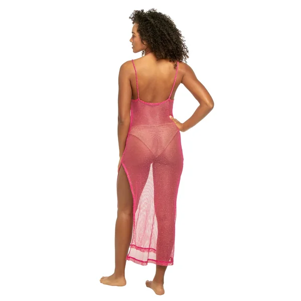 Dudley cover dress features metallic mesh, v-neckline, adjustable straps, and a side slit.