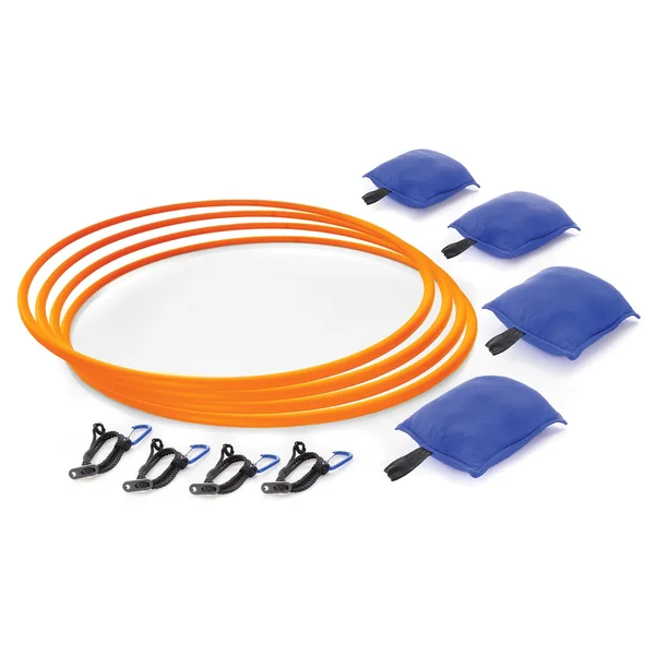 The soft neoprene bag prevents damage to pool floors and dries quickly due to its plastic bean filling. The carabiner clip allows for easy setup; simply clip the rope to the hoop and watch it sink! Set includes 4 DuraHoop Swimming Hoops, 4 weighted bags, and 4 ropes.