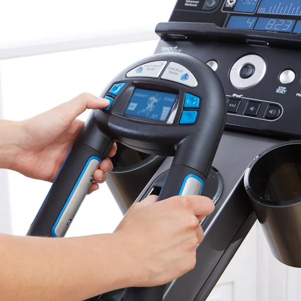 Contact heart rate sensors on moving multigrip handles and stationary grips, telemetry heart rate monitoring (wireless chest strap included with console) - ADJUSTABLE STRIDE