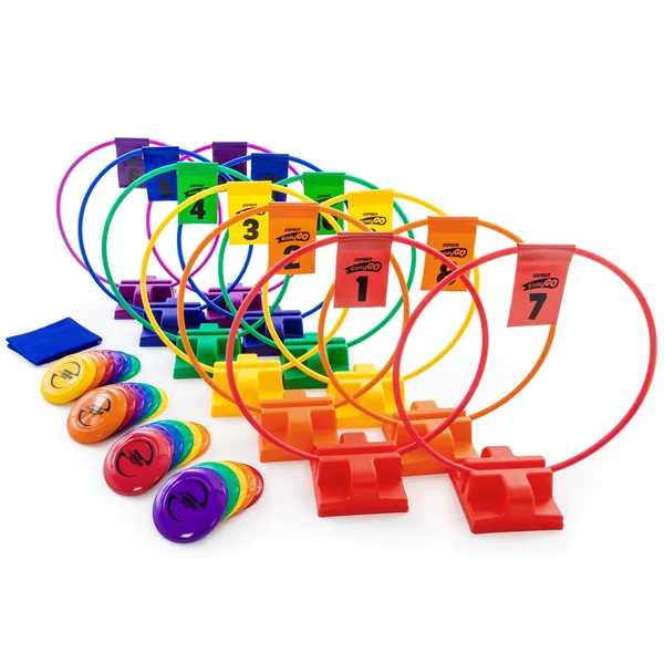 Each target consists of a DuraHoop Hoop (30″ dia), an ABS plastic HoopStandz Hoop Holder (11″L x 11″W x 5″H), and a numbered PVC flag (10″L x 6″W). Complete Set includes 12 targets, 12 flags (numbered 1-12), 24 AirRanger Plastic Discs (9″ dia), and a DuraBag Duffle for simple transportation and storage of all supplies.