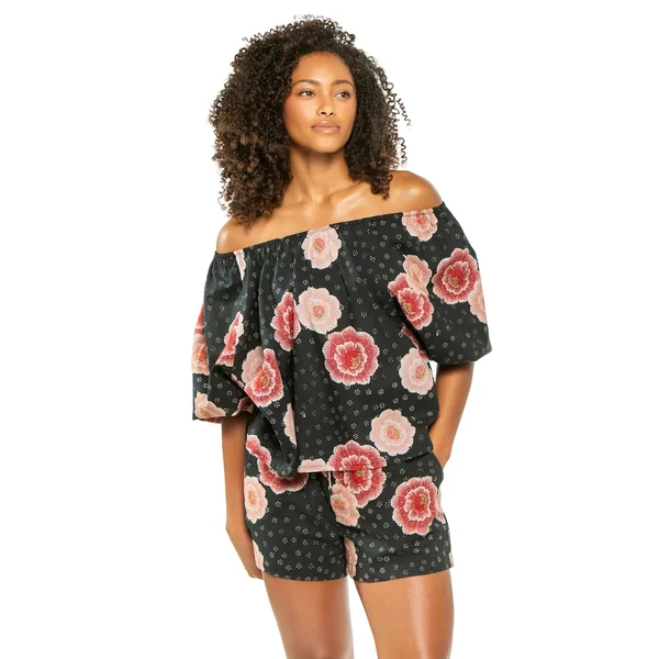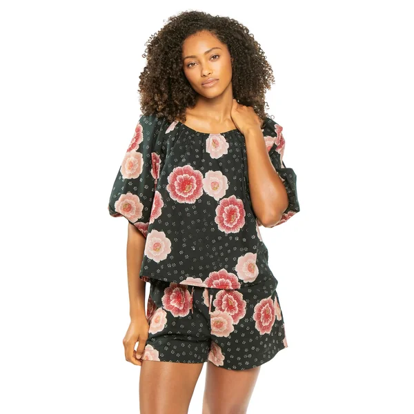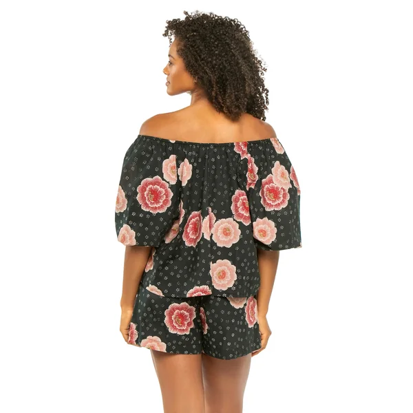 Ella blouse can be worn off the shoulder or over the shoulder with a scoop neckline and offers a loose fit and puffed sleeves with elastic cuffs.