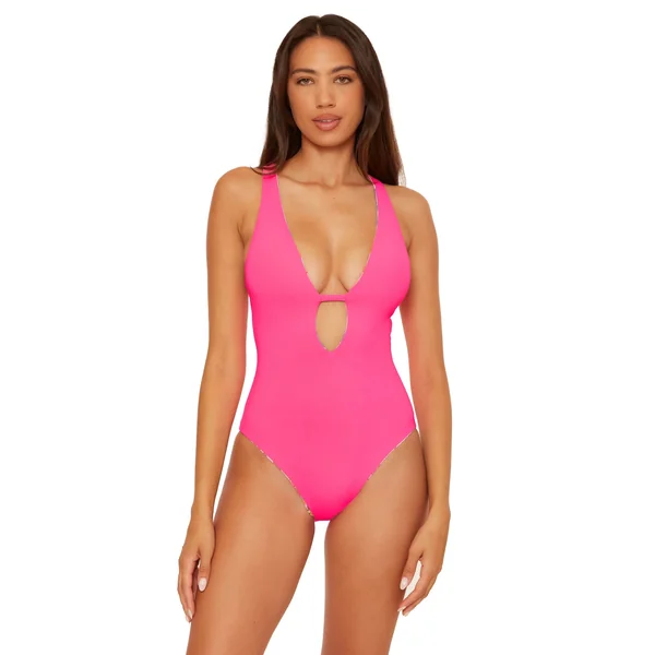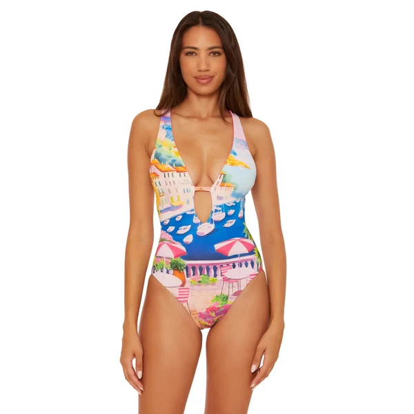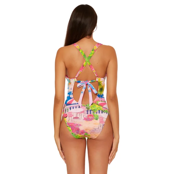 Reversible one piece swimsuit features seersucker textured fabric with Italian vacation scene. Offers a plunging neckline, soft cups, adjustable x-back straps, and a tie back closure.