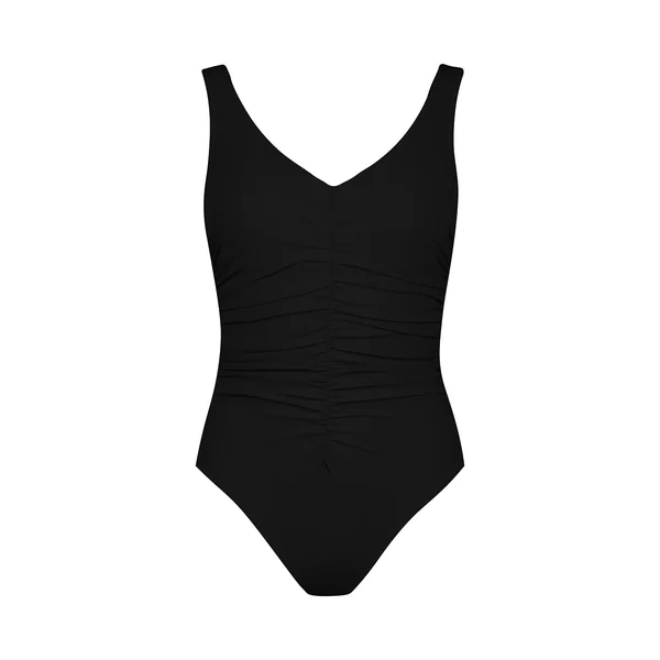One piece swimsuit features a flattering shirred bodice. Offers adjustable straps and moderate bottom coverage.