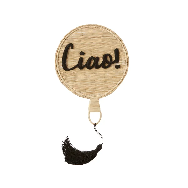 Handheld woven straw fan features embroidered “CIAO” appliqué patch with black thread and black accent tassel.