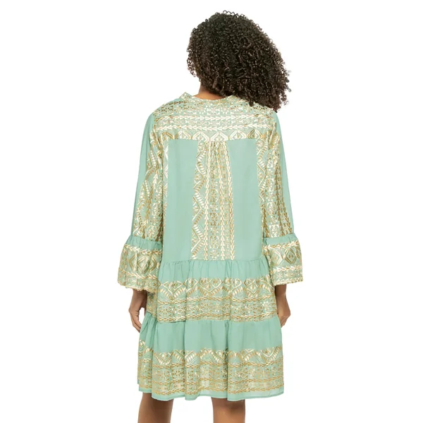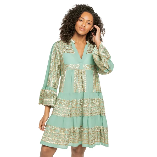 Mini dress features metallic embroidered details, a split neck, three-quarter flutter sleeves, and a tiered skirt.