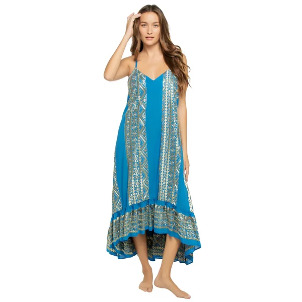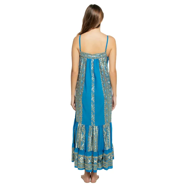 Midi dress features gold embroidery and asymmetrical ruffle hem. Offers adjustable straps and a loose comfortable fit.