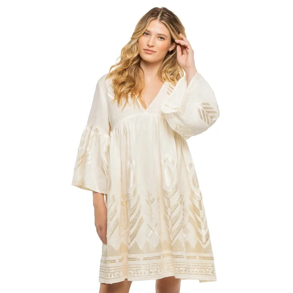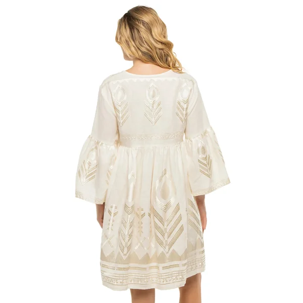 Mini dress features metallic feather embroidered details, a v-neckline, empire waist, and three-quarter bell sleeves.
