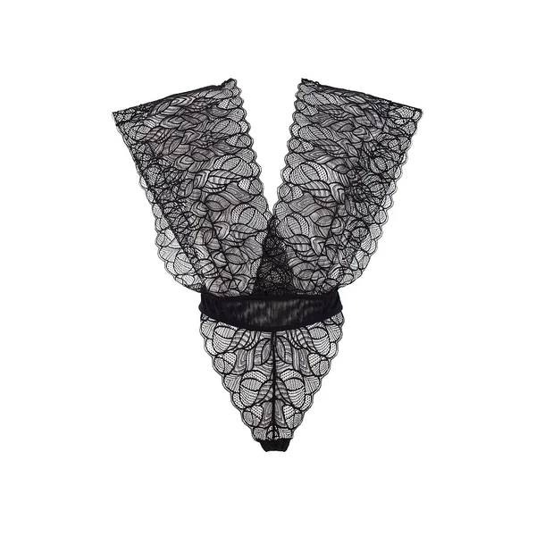 Exude romance in this style that features a deep plunge front and back, plus wide, intricate lace panels that sit perfectly across your shoulders to create a bold silhouette. Wear on its own as lingerie or pair with your favorite jeans.