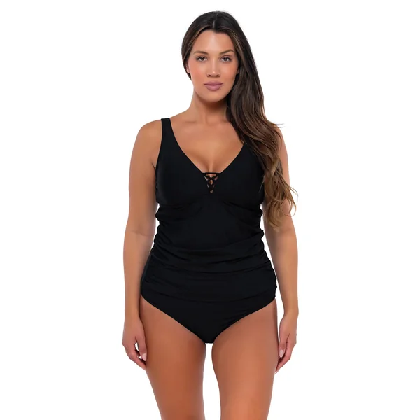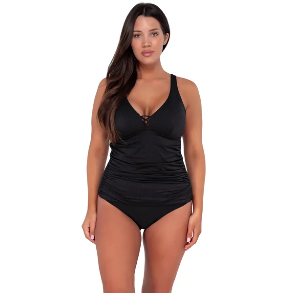 The Emerson tankini is a full coverage swim top with a slim fit. The shirred waist provides flattering modesty. A cute, fixed lace-up center adds stylish detail. Wide, adjustable straps give amazing support and comfort. Also features removable cups, underwire, and a j-hook for racerback conversion.