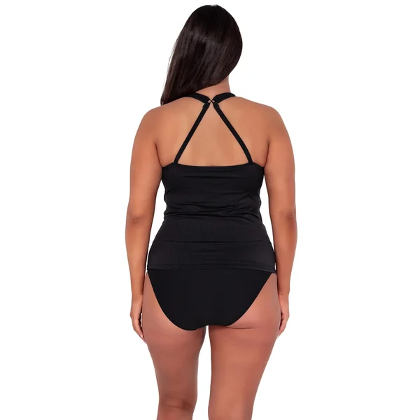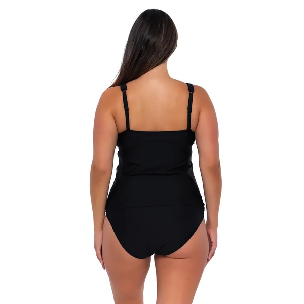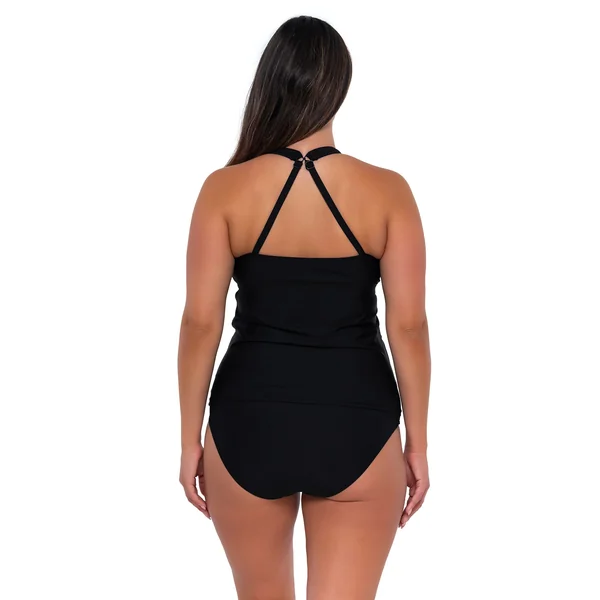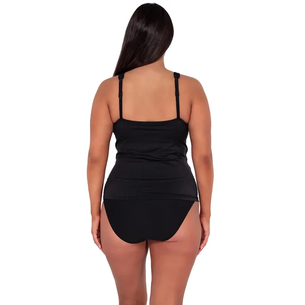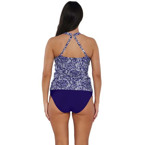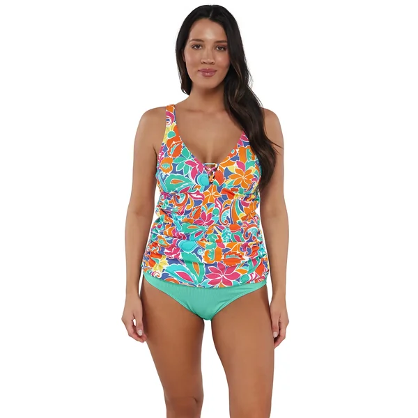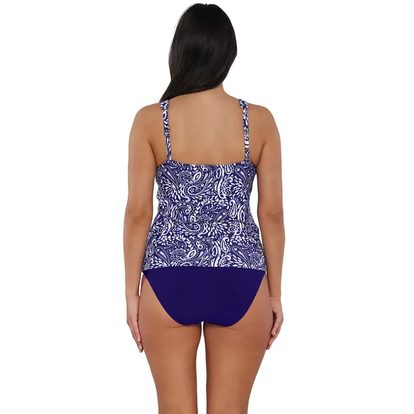 Emerson tankini is a full-coverage swim top with a slim fit. The shirred waist provides flattering modesty. A cute, fixed lace-up center adds stylish detail. Wide, adjustable straps give amazing support and comfort. Also features removable cups, underwire, and a j-hook for racerback conversion.