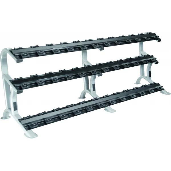 The York ETS Saddle Dumbbell Rack is as attractive as it is functional. The curved tubing and sturdy legs provide a high level of stability and ease of use. This storage rack is designed specifically for the Pro Style Dumbbell Series which fit easily into the saddles of this rack for protection against wear and tear. Each saddle is spaced 5” apart in order to ensure safe racking and un-racking of the dumbbells. This rack is available in two different options, 2-tier or 3-tier. The 2-tier option holds 10 pairs of Pro Style Dumbbells while the 3-tier option holds 18 pairs.