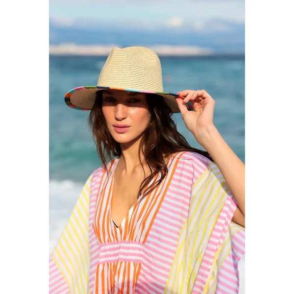 Eva panama hat features paper straw with a multi-colored brim trim.