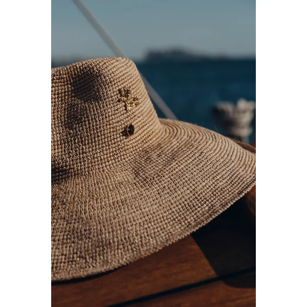 Eva wide brim panama hat is crafted from handwoven toquilla straw and features a gold-plated brooch and a semi-precious stone accent.