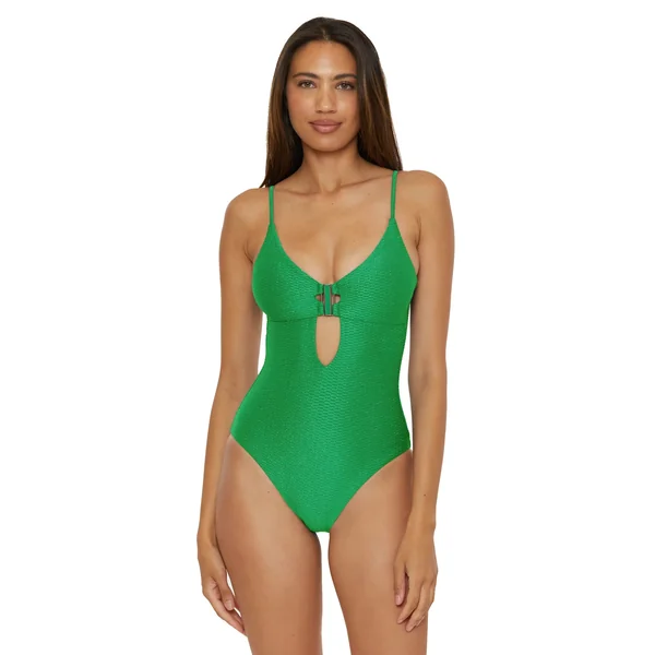 Evelynn textured one piece features silver metallic detailing and plunge neckline adorned with square buckle inlayed with matching enamel. Offers removable soft cups, adjustable straps, and a loop tie back closure.