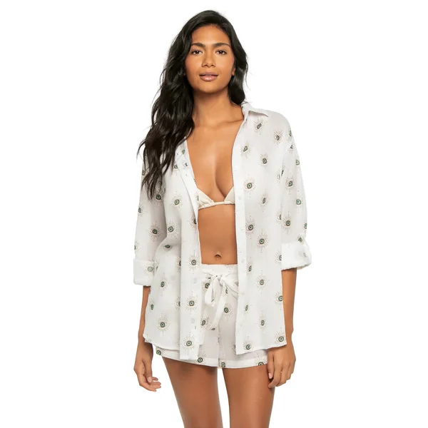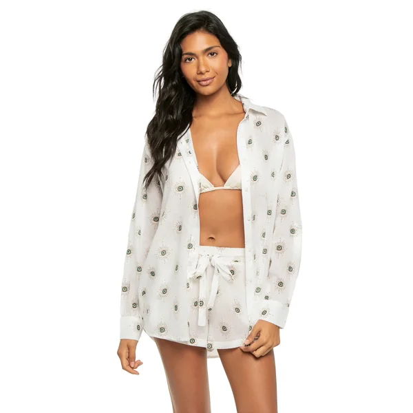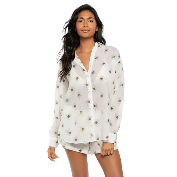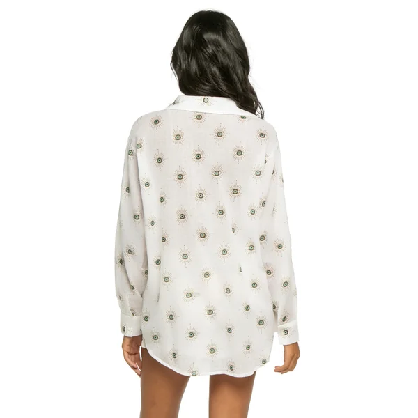 Shirt dress features evil eye print, button-up collared neckline, and long sleeves.