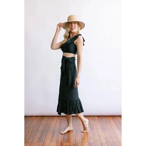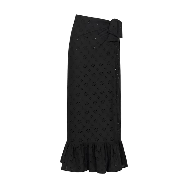 Sarong features eyelet detailing and ruffle hem. Offers a self tie waist closure.