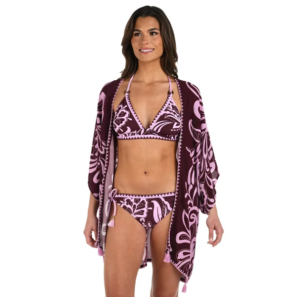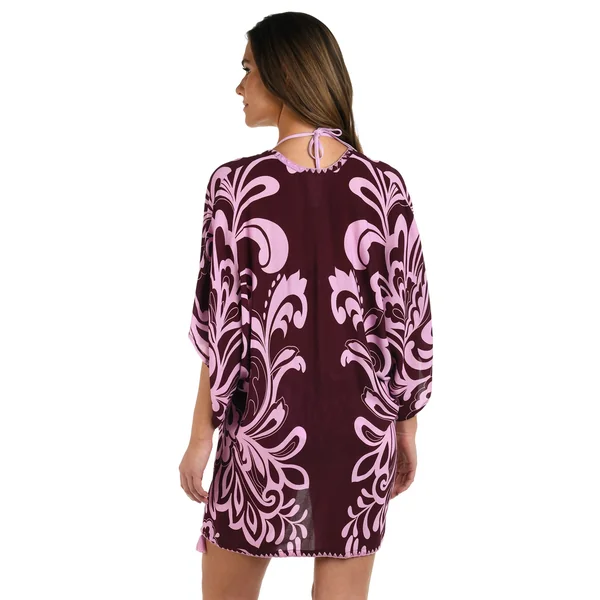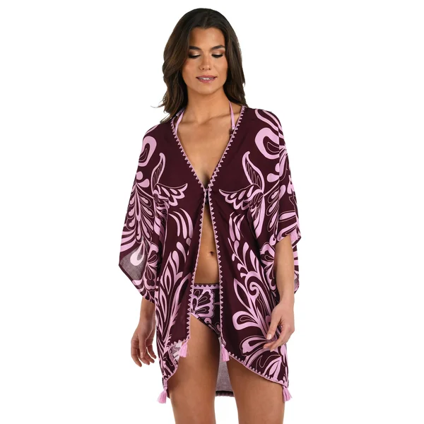 Kimono features oversized floral and leaf motifs, shell stitching, and tassel details.