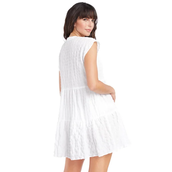 Fiona tiered tunic features a textured fabric and offers cap sleeves and a collared tie neckline.
