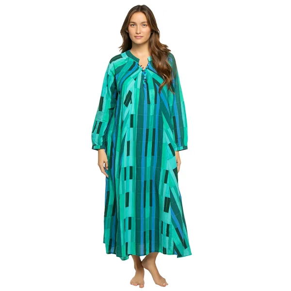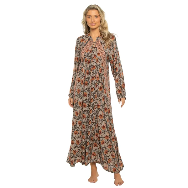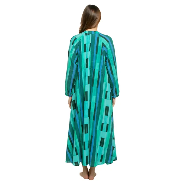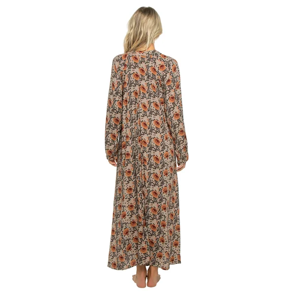 Fiore A-line maxi dress features v-neckline with covered buttons and voluminous long sleeves.