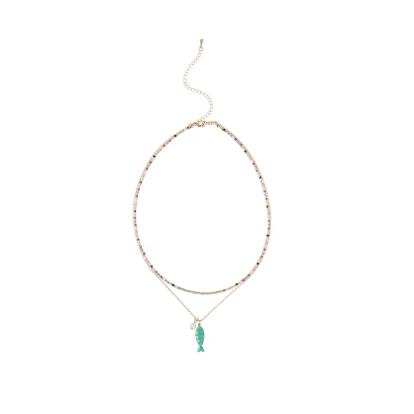 Necklace features a multicolored beaded chain, coated metal fish charm, and a lobster clasp closure.