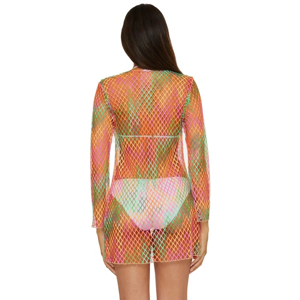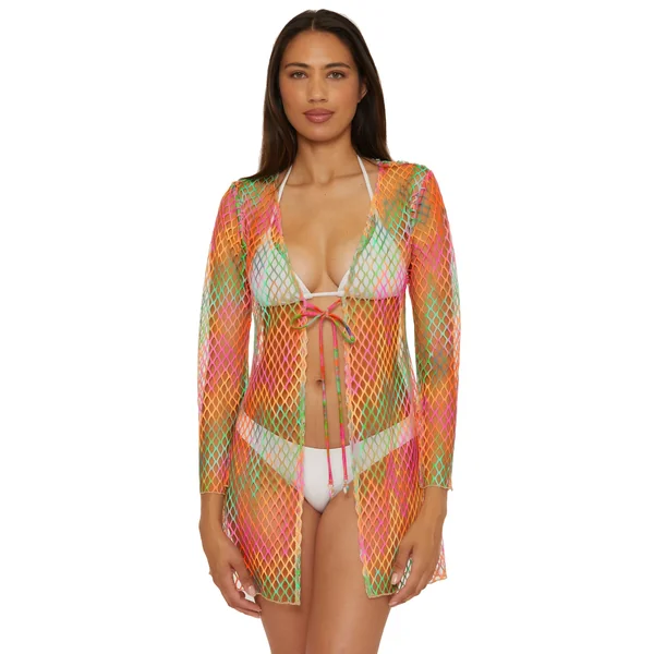 Colorful fishnet kimono features long sleeves and a tie front closure adorned with shell charms.