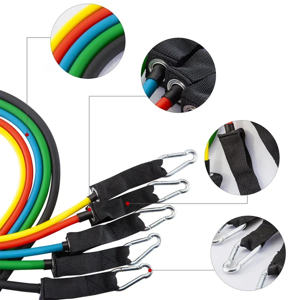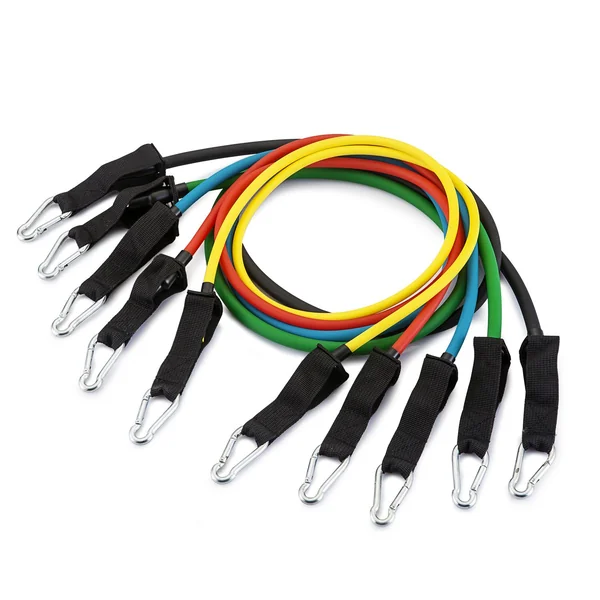 - STACKABLE BANDS FOR ADJUSTABLE RESISTANCE LEVELS. Comes as a set of 5, 48-inch long colored exercise bands. Yellow (5-10 lbs), Red (15-20 lbs), Green (20-25 lbs), Black (25-30 lbs), and Blue (30-45 lbs). Bands can also be combined together to provide up to 130 lbs of resistance. Metal clip system allows you to attach the included soft-grip handles or ankle straps for a more comfortable workout.