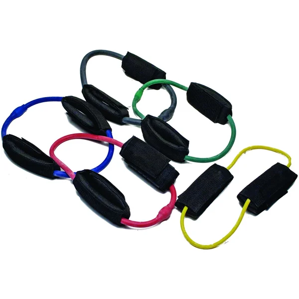 Large cuffs with extra padding make these comfortable to use when exercising. Formed into a ring with tow padded hook & loop cuffs . One size fits most ankles. Great for lower body exercises. Mix colors for quantity discount. New and improved foam handles. Resistance Levels in pounds at 100% Elongation.