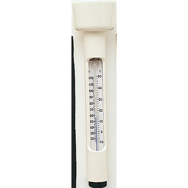 Floating swimming pool thermometer has a molded ABS plastic tube body with flotation cap. Cap has colorful design. Weight: 8 oz.