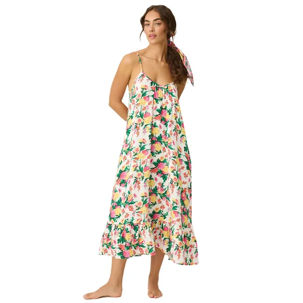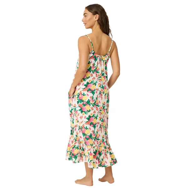 Midi dress features eye-catching floral print, flounce hem, adjustable straps, and side pockets.