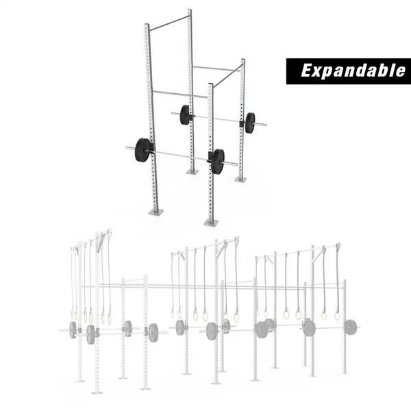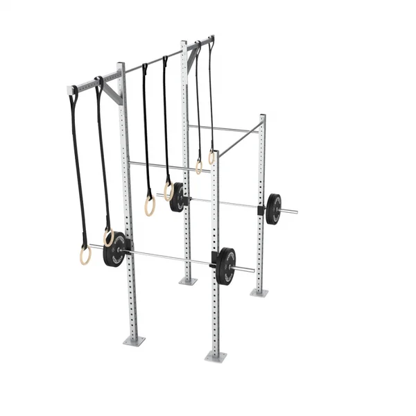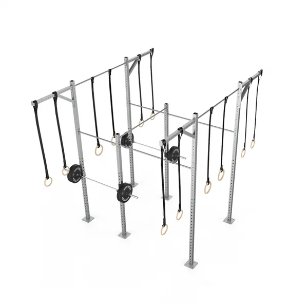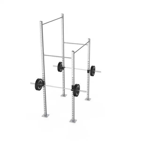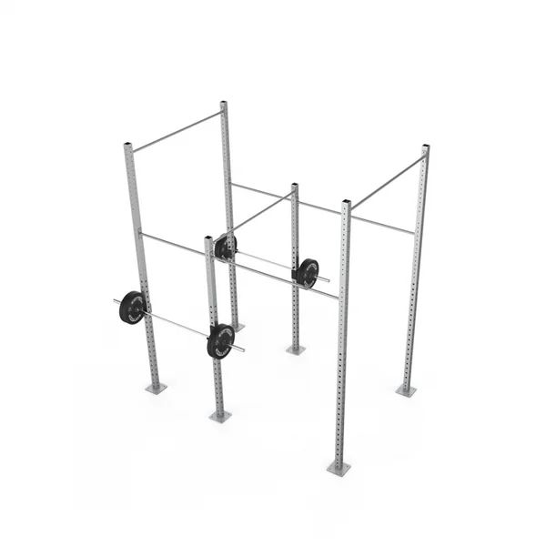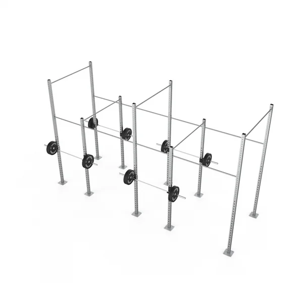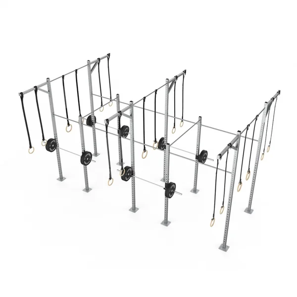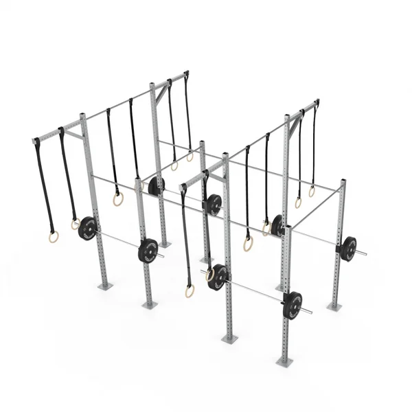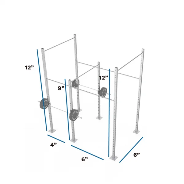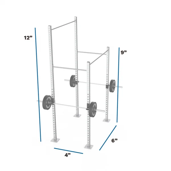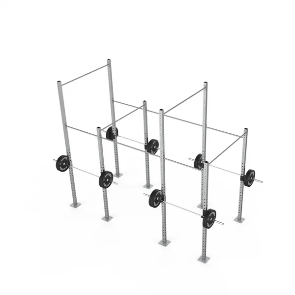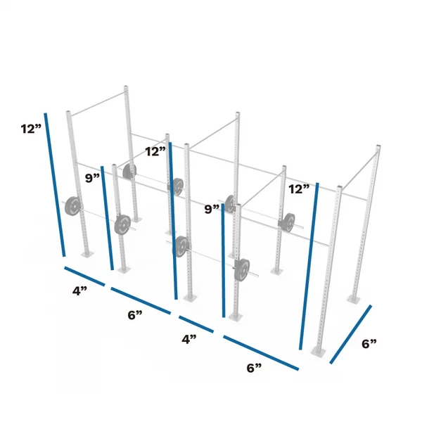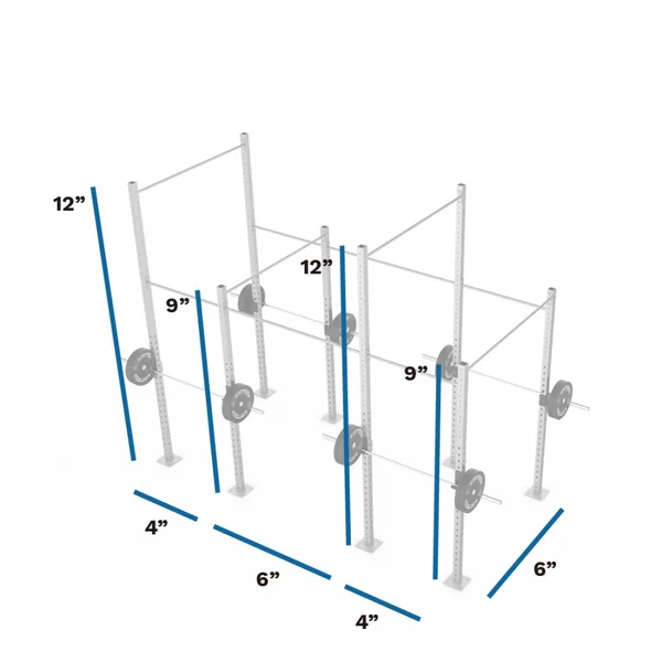 • 4′ Length x 6′ Depth: 2x Squat stations, 4x pull-up positions, 1x 12′ high pull-up bar for hanging rings