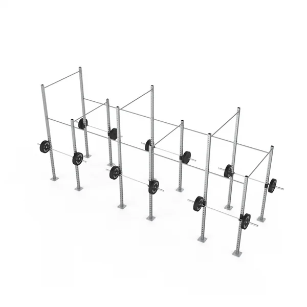 • 10′ Length x 6′ Depth: 2 Squat stations, 7x pull-up positions, 2x 12′ high pull-up bars for hanging rings