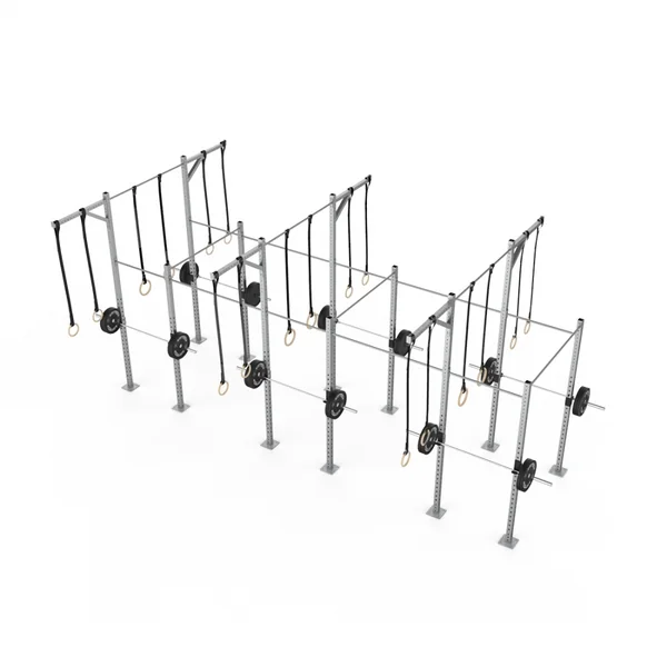• 20′ Length x 6′ Depth: 4x Squat stations, 14x pull-up positions, 3x 12′ high pull-up bars for hanging rings
