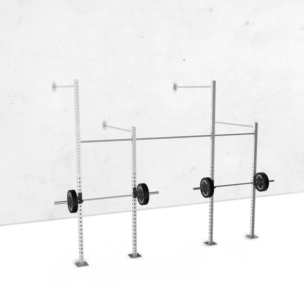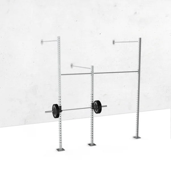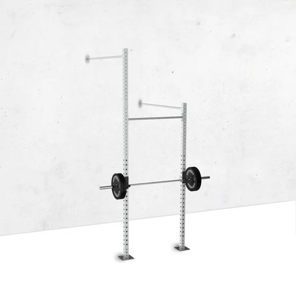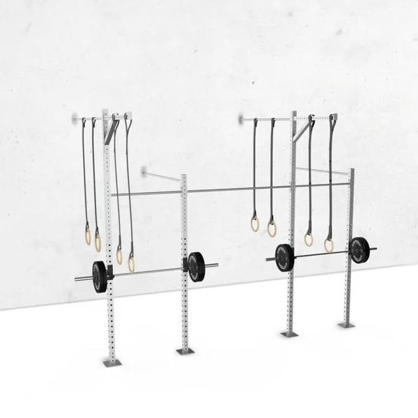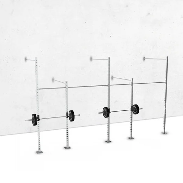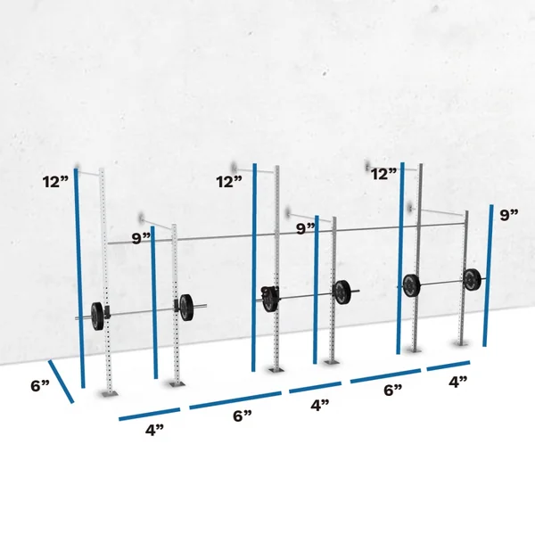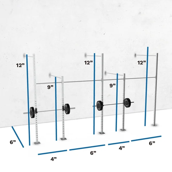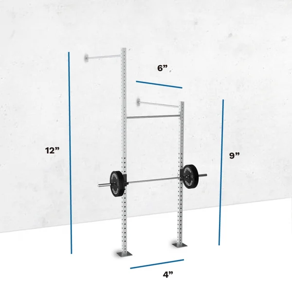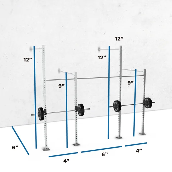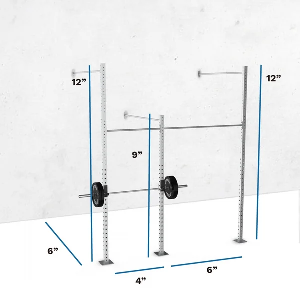 • 4′ Length x 6′ Depth: 1x Squat station, 3-5x pull-up positions, 1x 12′ high pull-up bar for hanging rings or lower for additional pull-up positions