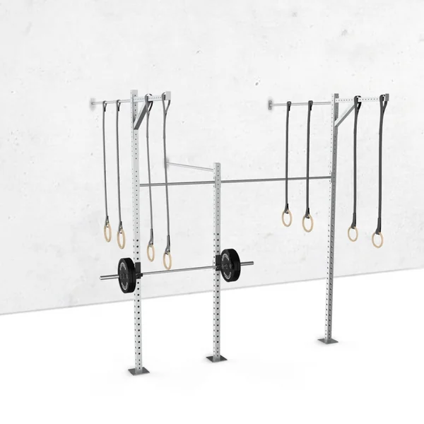 • 10′ Length x 6′ Depth: 1x Squat station, 4-6x pull-up positions, 2x 12′ high pull-up bars for hanging rings or lower for additional pull-up positions
