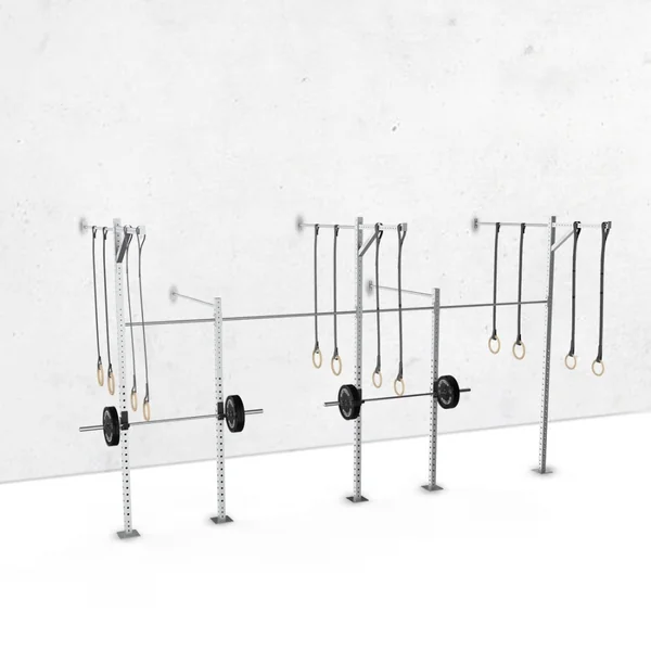 • 20′ Length x 6′ Depth: 2x Squat stations, 7-10x pull-up positions, 3x 12′ high pull-up bars for hanging rings or lower for additional pull-up positions