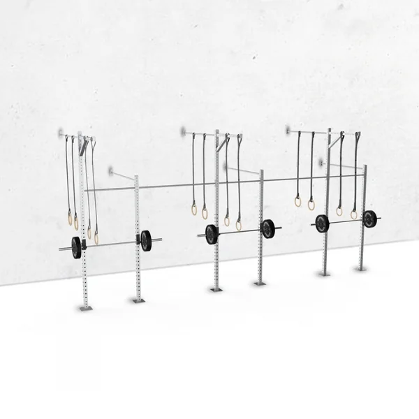 • 24′ Length x 6′ Depth: 3x Squat stations, 10-13x pull-up positions, 3x 12′ high pull-up bars for hanging rings or lower for additional pull-up positions