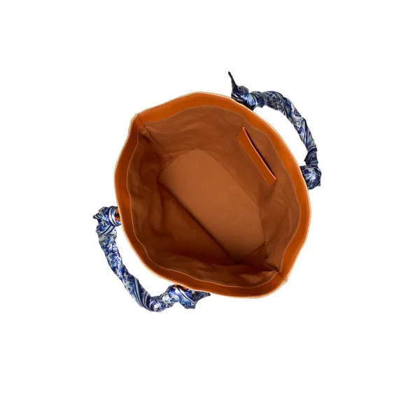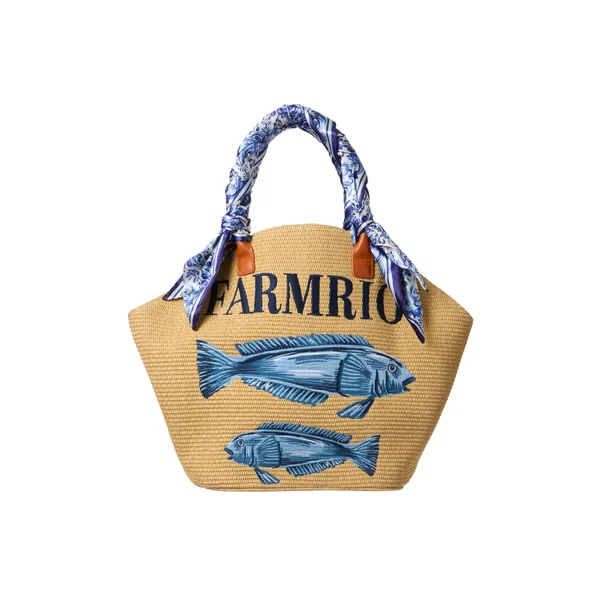 Raffia tote bag featuring an embroidered fish motif on the front. Designed with a leather strap adorned with removable satin scarves that double as versatile styling accessories. Finished with a canvas lining and a leather inner pocket.